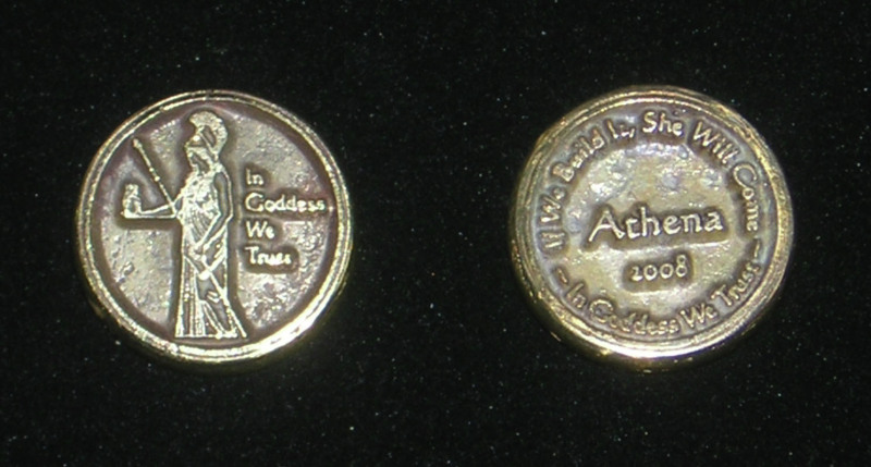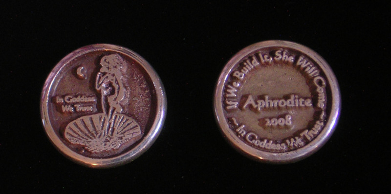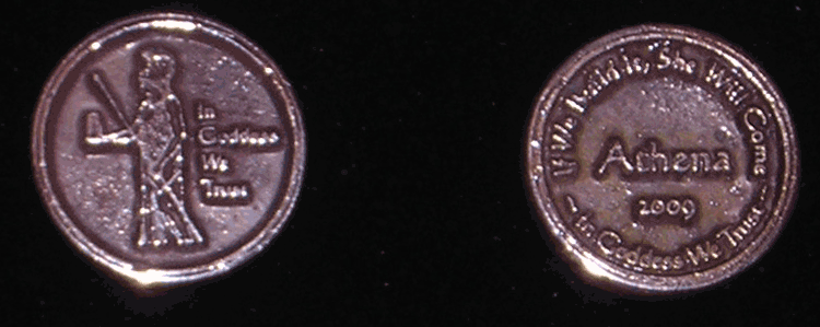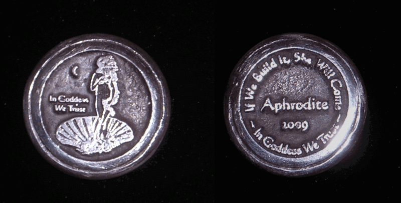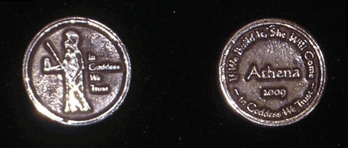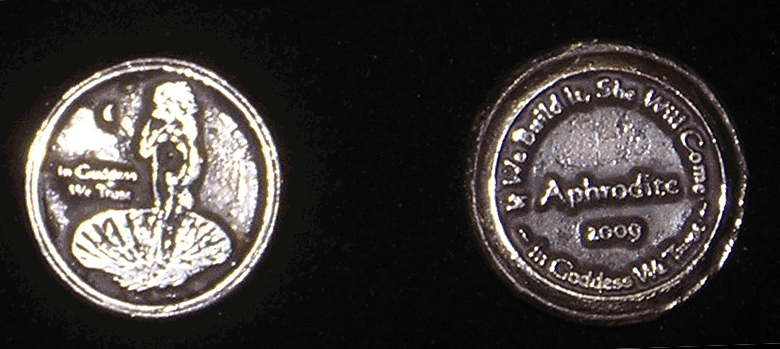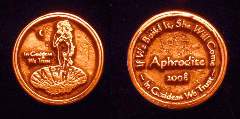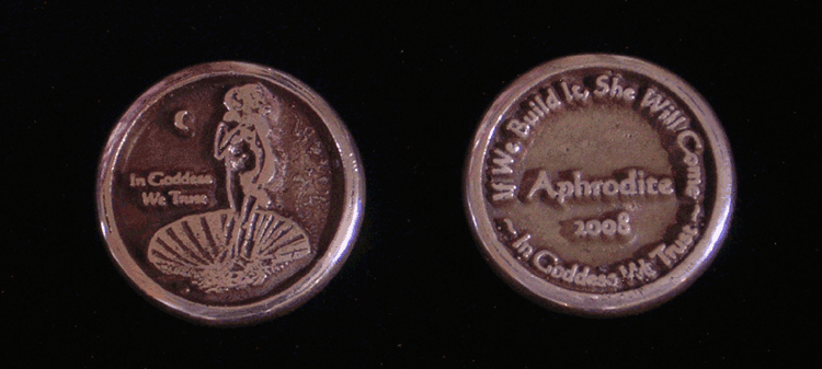 I have been making the Aphrodite Coins for years now, but as of 2008 she was joined by Athena, aka Minerva. Athena can be seen with her helmet, spear and her totem familiar, Bubo the Owl. These Olympian sisters are soon to be joined by Artemis, aka Dianna. I make some Sterling Silver and others with Bronze. The words "In Goddess We Trust" are on the front and back. Along with the name and year on the back in the middle, the upper ring reads "If We Build It She Will Come." They weigh slightly less than an ounce, and the outer edge is polished to a smooth finish that feels wonderful in your hand.